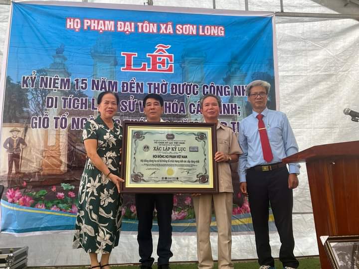 Tại buổi lễ, đại diện HĐHP tỉnh Hà Tĩnh đã trao tặng dòng họ Phạm xã Sơn Long bức ảnh in Bằng xác lập Kỷ lục công nhận HỘI ĐỒNG HỌ PHẠM VIỆT NAM là “Hội đồng dòng họ có tổ chức mạng lưới các cấp rộng nhất”.HĐGT Phạm Đình trao Giấy khen và quà cho các con, cháu trong dòng họ đạt thành tích cao trong học tập.