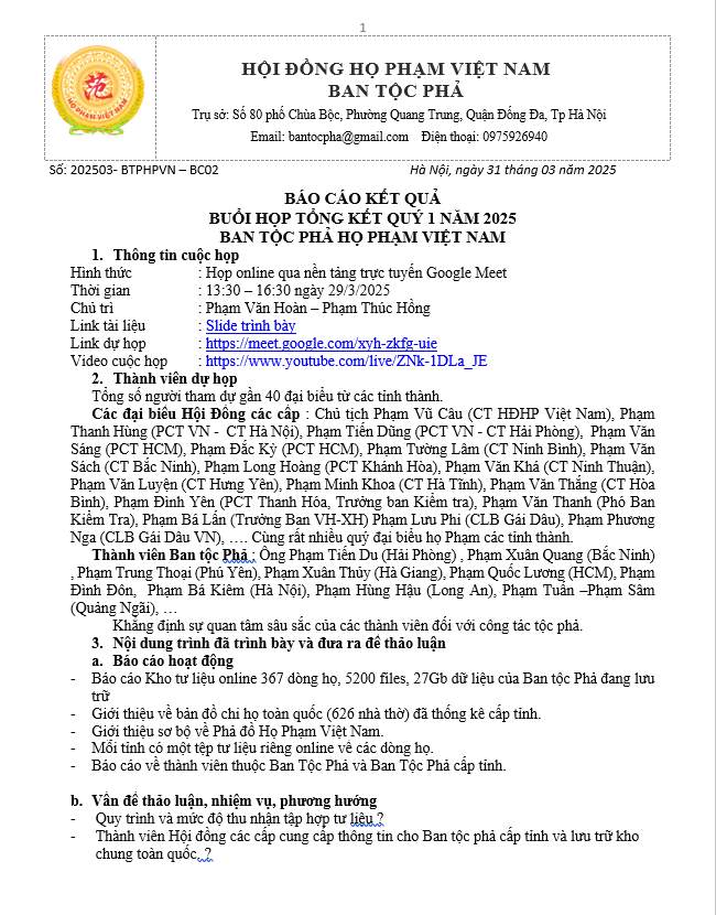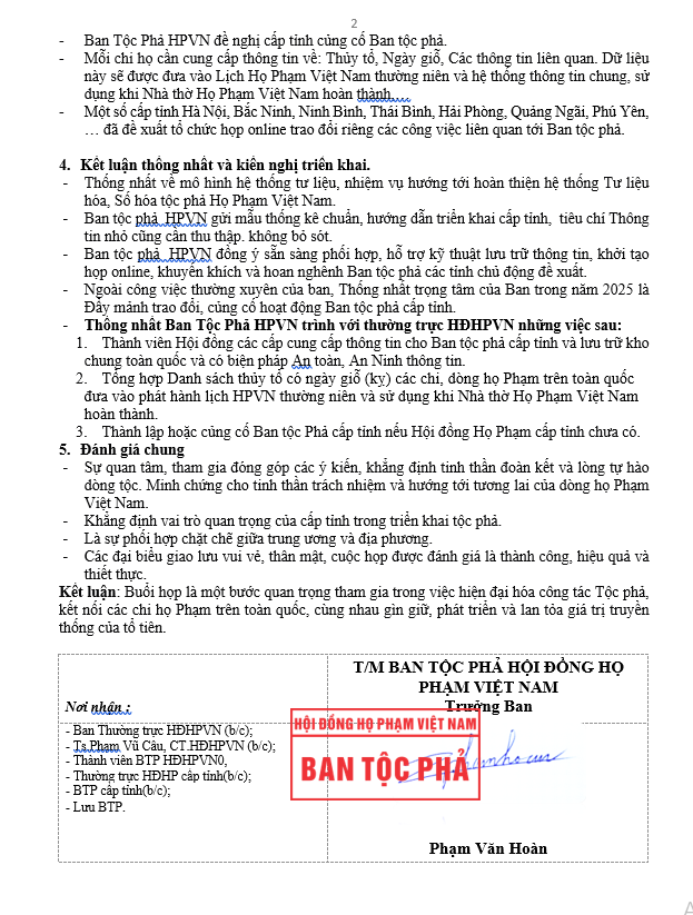 Kết luận: Buổi họp là một bước quan trọng tham gia trong việc hiện đại hóa công tác Tộc phả, kết nối các chi họ Phạm trên toàn quốc, cùng nhau gìn giữ, phát triển và lan tỏa giá trị truyền thống của tổ tiên.