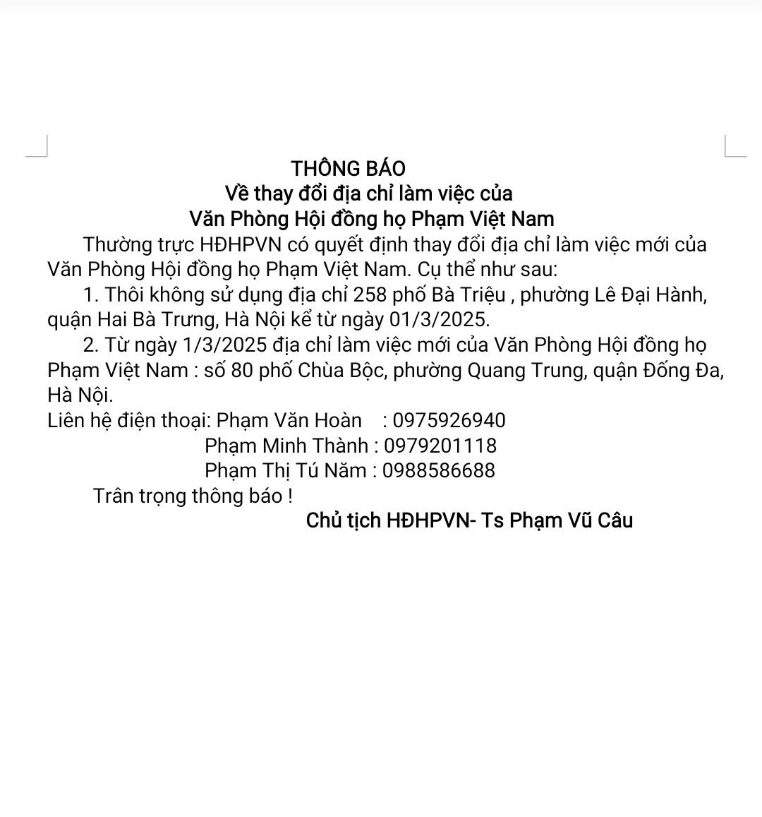 Trang chủThông báoHĐ Họ Phạm Việt Nam - thông báo thay đổi địa chỉ...