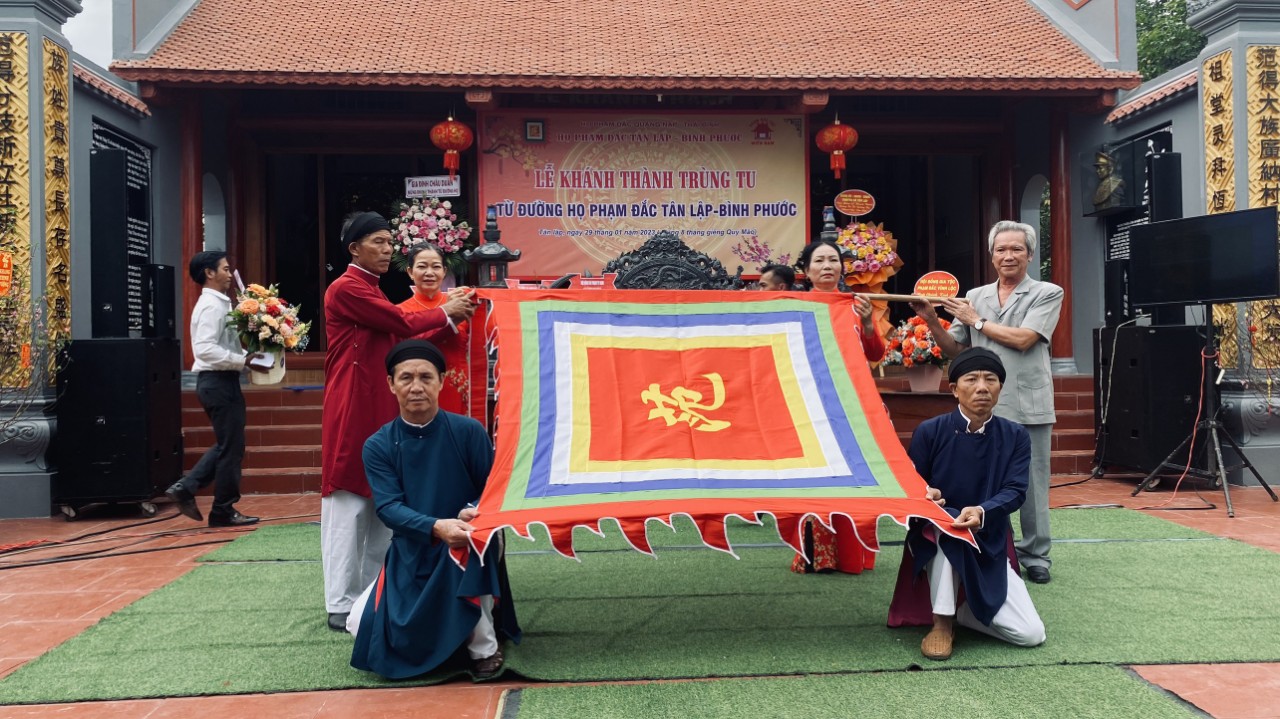 🛑Ngày mồng 8 Tết, dự Lễ khánh thành trùng tu Nhà thờ họ Phạm Đức tại xã Tân Lập, huyện Đồng Phủ, tỉnh Bình Phước. Nhà thờ này được xây dựng năm 1997 bởi bà con cô bác họ Phạm Đắc ở Quảng Nạp, tỉnh Thái Bình, vào lập nghiệp từ năm 1978. Tham dự lễ khánh thành có các vị Bí thư đảng ủy, Chủ tịch UBND và Chủ tịch MTTQ xã Tân Lập; đại diện HĐHP TPHCM. HĐHP tỉnh Đồng Nai và nhiều doanh nhân là thành viên Ban Kinh tế – HĐHPTP HCM…. Chủ tịch đã trao lá cờ họ Phạm Việt Nam cho ông Phạm Đức Hoàng, Trường Tộc họ Phạm Đắc xã Tân Lập, cùng mọi người có mặt làm lễ thượng cờ họ Phạm trong tiếng nhạc và lời ca hùng tráng của bài ca họ Phạm “ Họ Phạm trong lòng Mẹ Việt nam” – nhạc và lời của NS Phạm Hanh”.