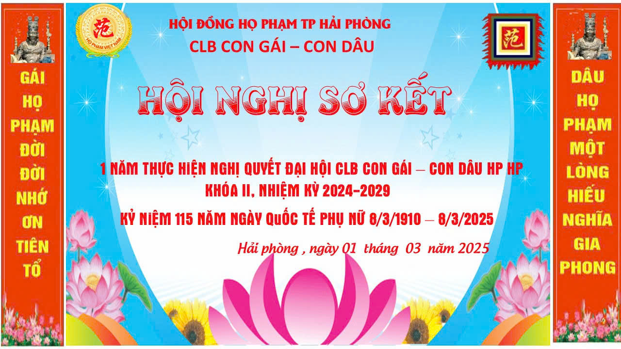 Thực hiện ý kiến chỉ đạo của Ông TS Phạm Tiến Dũng PCT HĐHPVN – CT HĐHPHP và chương trình công tác của CLB Con Gái – Con Dâu HP HP . Ngày 1/3/2025 tại Cung Hồng Ngọc Haidang Plaza 19 Trần Khánh Dư , Lê Chân .HP CLB Con gái – Con dâu HPHP đã tổ chức HộI NghỊ Sơ kết 1 năm thực hiện NQ CLB Con gái – Con dâu Họ Phạm Hải Phòng khóa 2 Nhiệm Kỳ 2024 – 2029. Và kỷ niệm 115 năm ngày quốc tế phụ Nữ 8/3/1910 – 8/3/2025 Dự Buổi lễ Có Bà NG Phạm Thị Lệ Trường PCT HĐHP VN – CN CLB CGCD HPVN trưởng đoàn . Bà Phạm Thị Sen PCN CLB CGCD HPVN Bà Ngô thị Mỹ Lệ PCN CLB CGCD HPVN . Về Phía Hải Phòng Có Ông TS Phạm Tiến Dũng PCT HĐHPVN _ CT HĐHPHP. Ông Phạm Tiến Du UVTT HĐHPVN – PCT TT HPHP . Ông Phạm Văn Mạnh UVHĐHPVN _ PCT Kiên Tổng Thư Ký HĐHPHP và các ông bà UVTT HĐHPHP , Chủ tịch – Phó Chủ tịch TT các Quận Huyện , Chủ Nhiệm – PCN các CLB trực thuộc HĐHPHP và gần 80 Đại biểu đại diện cho CLB Con Gái – Con Dâu HP HP Đã về Dự. chương trình văn nghệ chào mừng mở đầu chương trình là tiết mục múa của các cháu thiếu niên , nhi đồng lớp kế tục sự nghiệp dòng tộc và đất nước linh thiêng sông núi việt nam và với các tiết mục dàn dựng công phu , đẹp mắt ca ngợi quê hương đất nước và họ phạm .của các Thành viên CLB CG CD HPHP biểu diễn .Hội nghị đã tiến hành sơ kết hoạt động 1 năm và xây dựng phương hướng trong thời gian qua bằng xem và nghe video clip Bà Vũ thị Luận PCN TT CLB CGCD HP HP lên thông qua danh sách bổ sung , kiện toàn BCN CLB CGCD HPHP thành 31 thành viên .Bà NG Phạm Thị Lệ Trường PCT HĐHP VN – CN CLB CGCD HPVN đã phát biểu ý kiến và biểu dương công tác tổ chức thực hiện của CLB Con Gái – Con Dâu họ phạm HP là 1 trong 2 đơn vị CLB CGCD HPVN đã tổ chức chương trình này và một số ý kiến trong phương hướng nhiệm vụ năm 2025 của CLB CGCD HPHP . Ông TS Phạm Tiến Dũng PCT HĐHPVN _ CT HĐHPHP đã gợi mở một số yêu cầu nhiệm vụ trong thời gian tới của CLB CGCD HPHP nhất là với nhiệm vụ trọng tâm kết nối các CLB CGCD của 5 thành phố thi đua trong HĐHP VN .