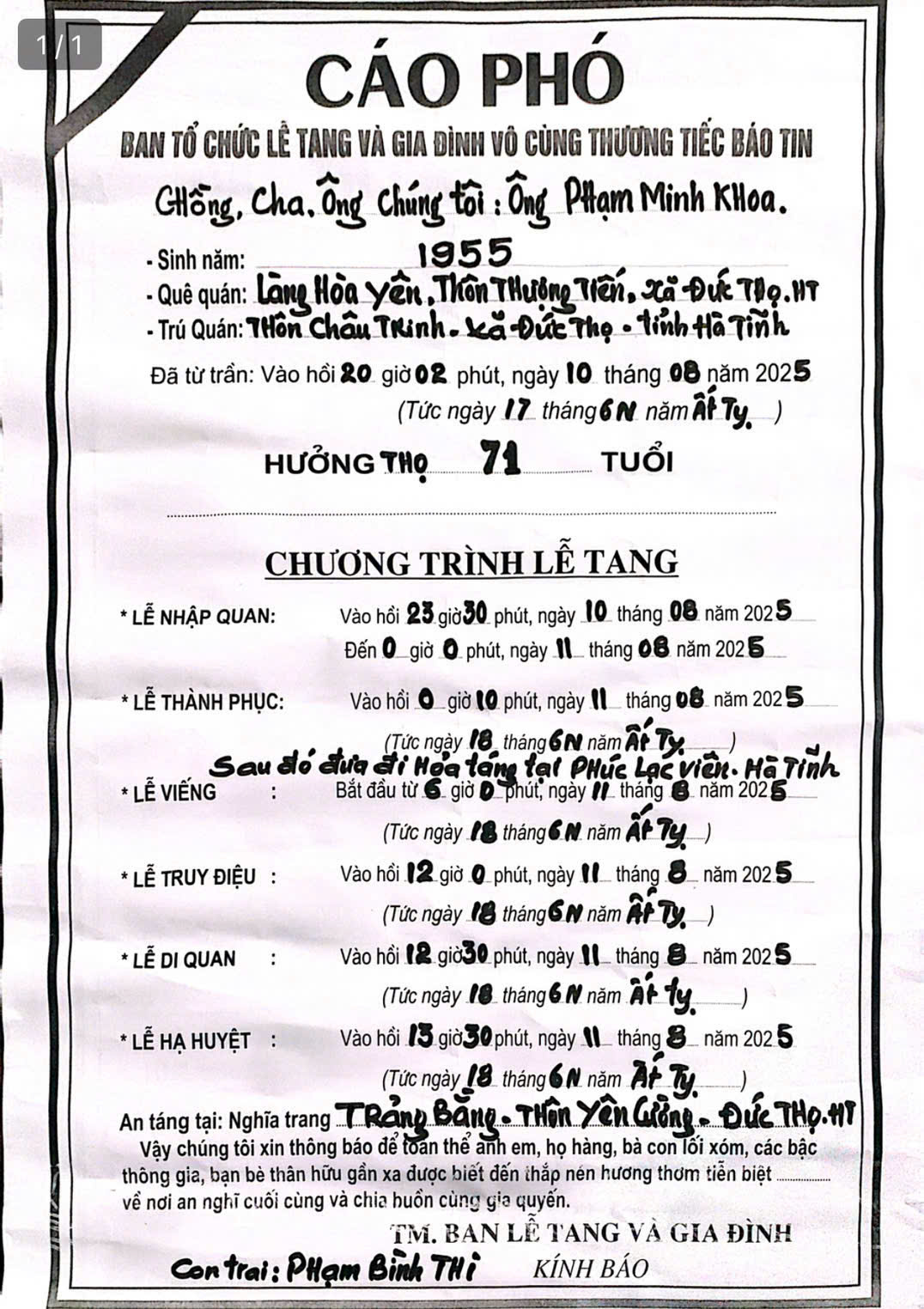 Ngày 11/8/2025, Đoàn Hội đồng Họ Phạm Việt Nam viếng ông Phạm Minh Khoa – Chủ tịch HĐHP Hà Tĩnh gồm: