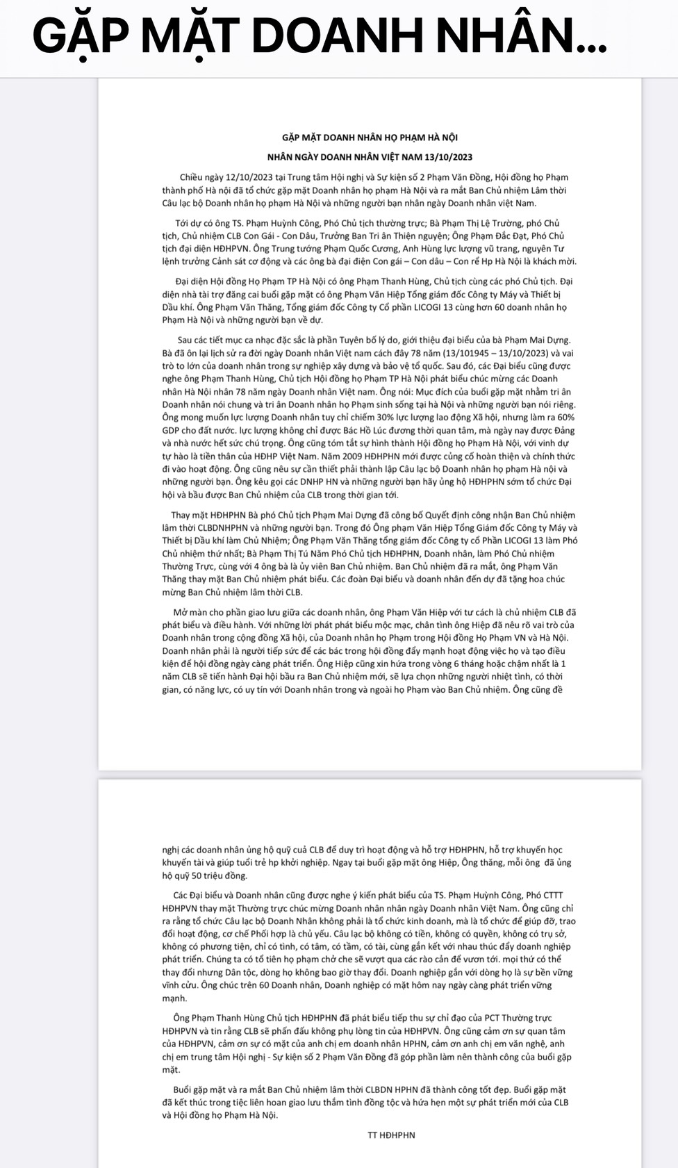 Chiều ngày 12/10/2023, tại Trung tâm Hội nghị và Sự kiện, số 2 Phạm Văn Đồng, Hội đồng họ Phạm thành phố Hà nội đã tổ chức gặp mặt Doanh nhân họ phạm Hà Nội và ra mắt Ban Chủ nhiệm Lâm thời Câu lạc bộ Doanh nhân họ phạm Hà Nội và những người bạn nhân ngày Doanh nhân việt Nam.