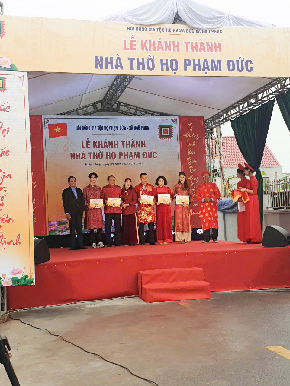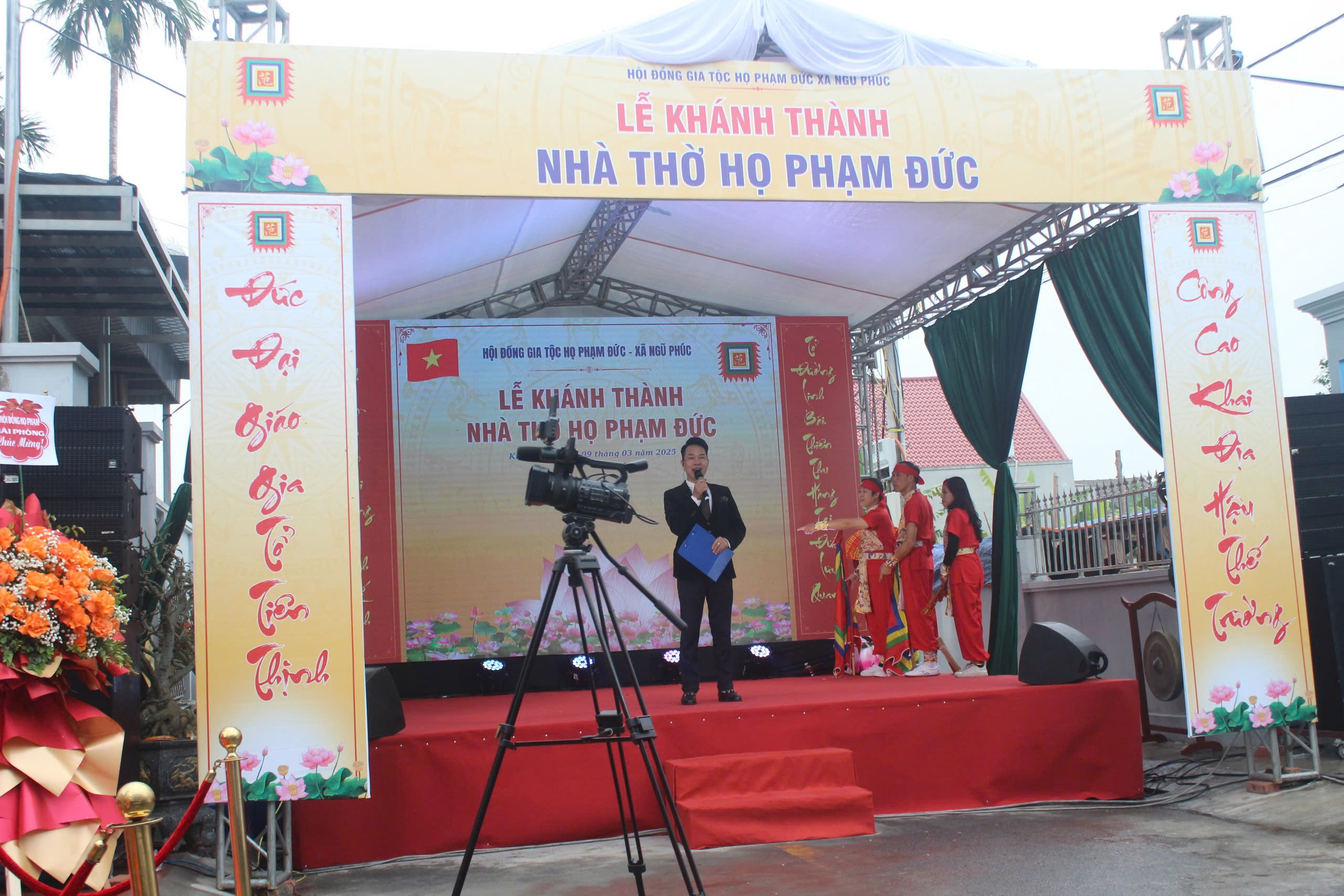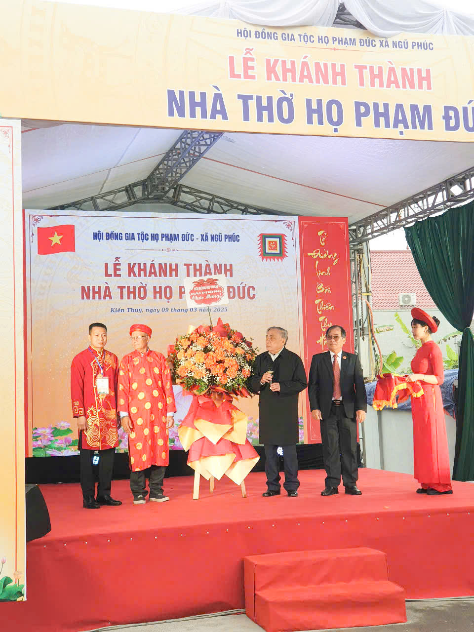 Sau tiếng trống khai lễ là báo cáo quá trình xây dựng nhà thờ và đọc Chúc Văn cắt băng khánh thành . Ông TS Phạm Tiến Dũng Nguyên Phó chủ Tịch UBND TP HP . PCT HĐHPVN – CT HĐHP HP cùng đoàn đã trao hoa chúc mừng, cờ họ Phạm Việt nam và cùng HĐGT làm lễ dâng hương tại từ đường gia tộc